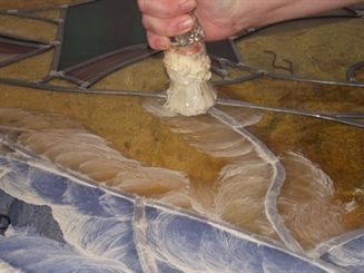La dernière étape de la fabrication d'un vitrail consiste à le rendre étanche par infiltration de mastic entre le verre et le plomb.